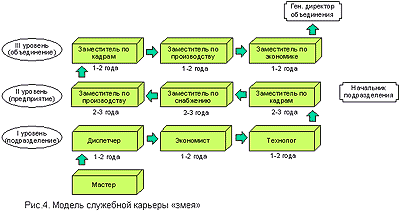 одель карьеры "змея" пригодна для руководителя и специалиста. Она предусматривает горизонтальное перемещение работника с одной должности на другую путем назначения с занятием каждой непродолжительное время (1-2 г.). Например, мастер после обучения в школе менеджеров работает последовательно диспетчером, технологом и экономистом, а затем назначается на должность начальника цеха. Это дает возможность линейному руководителю более глубоко изучить конкретные функции управления, которые ему пригодятся на вышестоящей должности. Прежде чем стать директором предприятия, руководитель в течение 6-9 лет работает заместителем директора по кадрам, коммерции и экономике и всесторонне изучает важные участки деятельности. Модель карьеры "змея" для линейного руководителя показана на рис. 4.