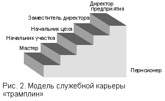 Карьера "трамплин" наиболее характерна для руководителей периода застоя в экономике, когда многие должности в центральных органах и на предприятиях занимались одними людьми по 20-25 лет. С другой стороны, данная модель является типичной для специалистов и служащих, которые не ставят перед собой целей продвижения по службе. В силу ряда причин: личных интересов, невысокой загрузки, хорошего трудового коллектива, приобретенной квалификации - работников вполне устраивает занимаемая должность, и они готовы оставаться в ней до ухода на пенсию. Таким образом, карьера "трамплин" может быть вполне приемлемой в условиях рыночной экономики для большой группы специалистов и служащих.