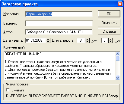 Срок реализации проекта рассчитан на 3 года. При этом деятельность по реализации проекта фирма начинает с 01.01.2008. Заголовок проекта представлен на рисунке 1.