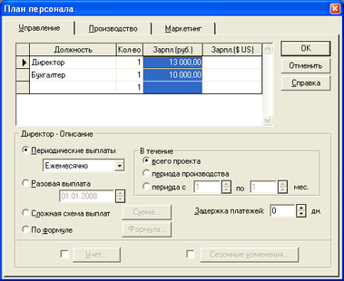 Каждый из работников будет нанят на зарплату в виде оклада (рис. 13): директор на 13000 рублей, бухгалтер на 10000 рублей, три парикмахера на 8500 рублей, уборщица на 4000 рублей.