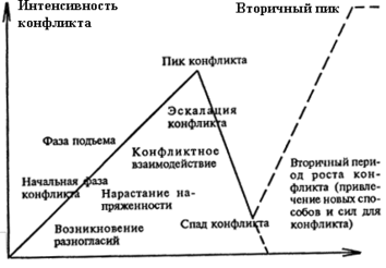 Если менеджер “входит и управляет конфликтом” в начальной фазе, он разрешается на 92%; если на фазе подъема — на 46%, а на стадии пик — менее 5%, на стадии спада — около 20%, на стадии вторичный период роста — менее 7%, на стадии вторичный пик — менее 2%.