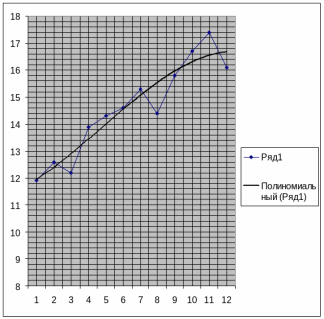 При визуальной оценке наличия в графике тенденции можно отметить сильную его приближенность к полиному высокого порядка (шестой степени), использование которого нецелесообразно, поскольку полученные таким образом аппроксимирующие функции будут отражать случайные отклонения, что противоречит смыслу тенденции.