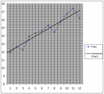 Из графика видно, что построенный линейный тренд отражает тенденцию исходного ряда: возрастающий тренд.