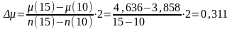 Найдем μ для n=12 следующим образом. Значение μ для n=10, согласно приложению 1, равно 3,858. Увеличение μ при изменении n на 2 шага найдем следующим образом