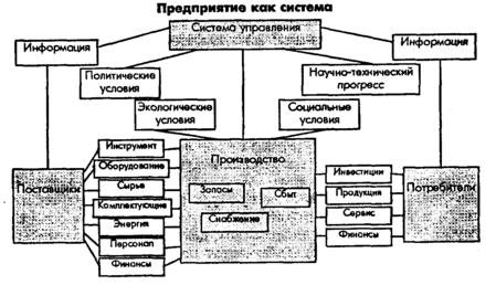 Предприятие представляет собой производственную систему. С управленческой точки зрения его можно рассматривать как организацию, под которой понимается группа лиц, взаимодействующих друг с другом ради достижения общей цели с помощью различных вещественных, правовых, экономических и иных условий.