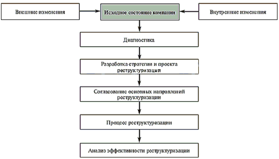 Реструктуризация компании - это изменение структуры компании (иными словами порядка, расположения ее элементов), а также элементов, формирующих ее бизнес, под влиянием факторов либо внешней, либо внутренней среды (Рисунок 1). Реструктуризация включает: совершенствование системы управления, финансово-экономической политики компании, ее операционной деятельности, системы маркетинга и сбыта, управления персоналом.