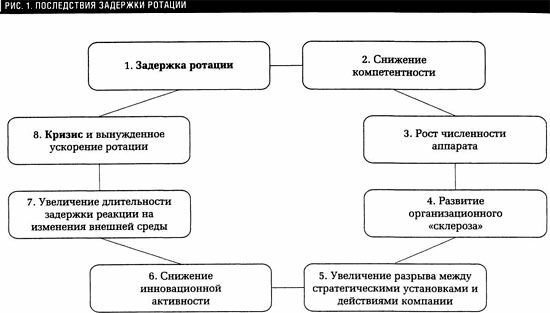 Чем дольше организация обходится без управляемой ротации руководства, тем больше в ней некомпетентных менеджеров. Численность аппарата повышается, а эффективность его работы снижается. Это приводит к развитию организационного «склероза». Он сопровождается разрывом между стратегическими установками, миссией компании и ее практической деятельностью. При этом снижается инновационная активность. Работники перестают реагировать на изменение внешней среды. Устранение возможных соперников становится главной целью руководства организации на максимально длительный срок. Все эти явления способствуют наступлению кризиса компании, который может привести к ее разрушению или радикальной реорганизации.