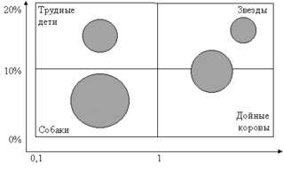 В начале семидесятых годов известная консалтинговая фирма Boston Consulting Group (BCG) разработала схему управления портфелем продуктов, получившую известность как "матрица BCG".Появление модели BCG явилось логическим завершением одной исследовательской работы, проведенной в свое время специалистами консалтинговой компании Boston Consulting Group. Эта модель, представляет, из себя своеобразное отображение позиций конкретного вида бизнеса в стратегическом пространстве, определяемом двумя координатными осями, одна из которых используется для измерения темпов роста рынка соответствующего продукта, а другая - для измерения относительной доли продукции организации на рынке рассматриваемого продукта.