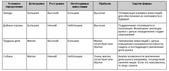 Модель BCG предполагает, чтобы организация устанавливала цели в отношении своей желаемой доли рынка на начальной стадии жизненного цикла продукта, цели относительно способов завоевания и удержания своего рынка на стадии роста жизненного цикла продукта, а цели в отношении получения и распределения получаемого дохода только на стадии зрелости жизненного цикла.