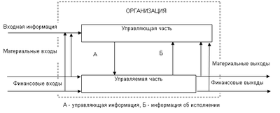 Процесс управления предусматривает согласованные действия, которые обеспечивают осуществление общей цели или набора целей, стоящих перед организацией. Для координации действий должен существовать специальный орган, реализующий функцию управление. Поэтому в любой организации выделяется управляемая и управляемые части. Схема взаимодействия между ними показана на рис. 1.2.