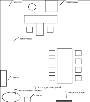 Внутренний объем и форма кабинета. В зависимости от ранга руководителя приемлемая площадь будет от 20 до 50 м2 и высота кабинета минимум 3,5 м. Форма кабинета также имеет большое значение, так как рабочий кабинет руководителя не просто место где он непосредственно работает, но и как правило место проведения планерок, собраний, совещаний. Учитывая это, наиболее рациональной является прямоугольная форма кабинета с соотношением сторон 1: 2;