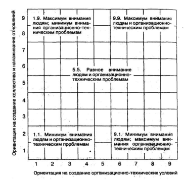 Руководитель, находящийся на поле 5.5. примерно поровну делит свои "привязанности" между людьми и организационно-техническими факторами производства. Он твердо стоит на ногах во всех сферах управленческой деятельности, однако не хватает с неба звезд.