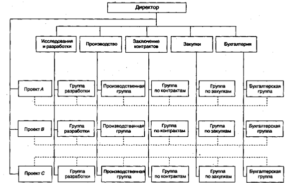 | Матричная | Сложносочиненная структура, выстроенная по принципу координатно-кооперационной взаимосвязи и конфигурации, представляемая программно-целевыми, проблемными, проектными, продуктными и другими вариациями |