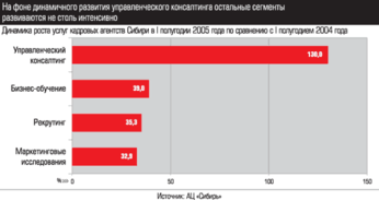 У кадровых агентств постепенно расширяется доля дополнительных направлений деятельности. Если в первом полугодии 2004 года выручка от подбора персонала в общей структуре поступлений составляла 53%, то в первом полугодии 2005−го - только 42%. Особенно динамично развивается управленческий консалтинг, поступления от которого выросли по сравнению с предыдущим периодом на 130%. Такого результата агентствам удалось добиться благодаря 50 реализованным консалтинговым проектам (в прошлом году - 31).