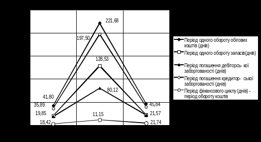 Як показано графіками рис.2.6 у 2005 році відносно 2004 року з нарощенням обсягів операцій період обороту оборотних агрегатів 1,4 – 2,5 рази, що підняло відповідно строк фінансового та операційногоциклу та свідчить про зни-ження темпів ділової активності підприємства при нарощенні обсягів діяльності. У 2006 році відносно 2005 року з подальшим нарощенням обсягів операцій період обороту оборотних агрегатів знизився знов 1,4 – 2,5 рази до рівня оборотності 2004 року, тобто підприємство знайшло стійкий ринок збуту та різко відновило темпи ділової активності при нарощенні обсягів діяльності.