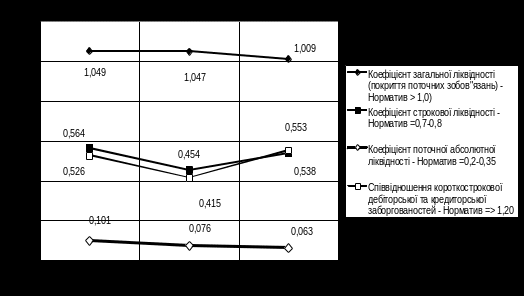 Платоспроможність підприємства – це здатність підприємства впевнено сплачувати всі свої боргові зобов’язання згідно з встановленими строками або відповідно до договірних умов[13], визначається системою показників ліквідності оборотних активів балансу. Знаменник в усіх наведених показників один і той самий – поточні пасиви, тобто термінові невідкладні зобов’язання.