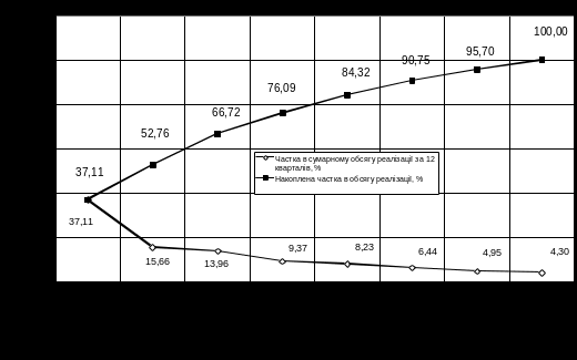 Рис.3.1. – Результати побудови кривої ABC –аналізу реалізації основних асортиментних груп продукції ПП "Монолит Пласт"