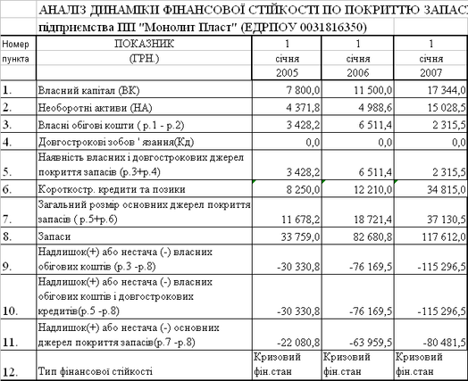 Таблиця 2.5 Результати розрахунку стійкості ПП "Монолит Пласт" по покриттю запасів