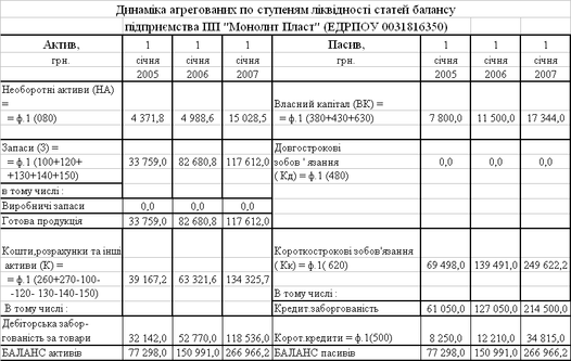 Таким чином, у 2004 – 2006 рокахі підприємство ПП "Монолит Пласт" почало і продовжує свою діяльність в в кризовій полосу неліквідності балансу в короткострокових та довгострокових періодах, що зафіксовано у раніше вказаному факті використання у 2004 - 2006 році грошової маси на закупівлю товарних запасів.