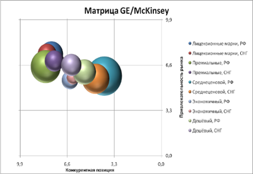 Как видно из диаграммы, большинство СЗХ подвержены риску потерять свой уровень рентабельности, т. к. он несоразмерно велик по сравнению с занимаемой долей рынка, также СЗХ «Среднеценовой, РФ» и «Премиальный, РФ» могут лишиться нынешней доли рынка. Поэтому руководство компании должно срочно предпринять меры по предотвращению этих угроз, и в благоприятном исходе СЗХ. Обладающий высокой рентабельностью, увеличить свою долю рынка, а СЗХ, имеющие высокую долю рынка, смогут поднять рентабельность до должного уровня.