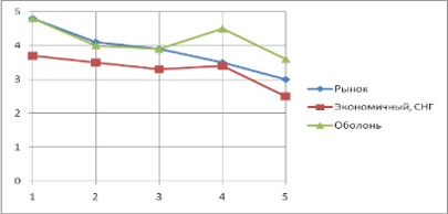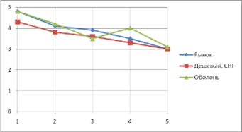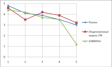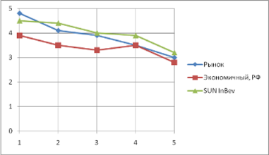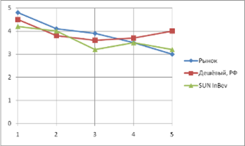 Перейдём к рассмотрению последней ценовой категории – самого дешёвого пива, продающегося на территории России. И компания «Балтика», и её основной конкурент имеют практически одинаковые гребешковые диаграммы, хотя, например, в цене Sun InBev уступает изучаемой фирме, отсюда вытекает закономерное минимальное лидерство компании «Балтика».