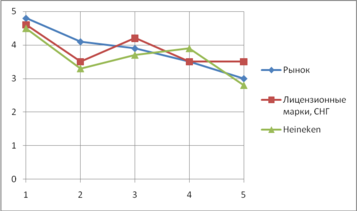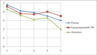 И в среднеценовом секторе на рынке России основным конкурентом Балтики является Heineken. Но вот, что интересно: здесь ситуация кардинально меняется, и лидером рынка становится изучаемая компания, значения покупательских критериев которой практически полностью соответствуют желаемым. Отсюда и закономерное чистое лидерство по этой зоне хозяйствования.