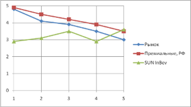 Очевидно полное преимущество премиальных марок пива компании «Балтика» над аналогичной зоной хозяйствования у главного конкурента. По всем критериям значения СЗХ «Премиальные, РФ» выше не только, чем у SUN InBev, но и желаемых потребительских значений, что, безусловно, намного важнее.