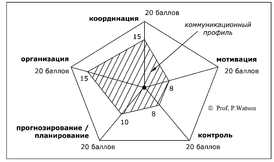 Общее состояние системы менеджмента организации отражает графическое изображение состояния критерия "коммуникация" - "коммуникационный профиль", построенный с учетом результатов по каждому из пяти оценочных критериев функциональной модели. Такой подход позволяет ясно увидеть направления, по которым необходимы первоочередные улучшения системы менеджмента. Так, на рис. 2б. изображен коммуникационный профиль организации, который указывает на то, что компания имеет проблемы с мотивацией и контролем, и эти направления менеджмента нуждаются в детальном анализе и совершенствовании