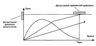 • цель может быть достигнута в предусмотренные сроки в пределах допустимого временного диапазона (кривая 2);