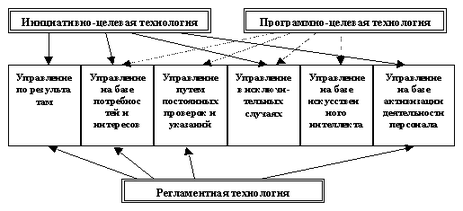 В состав процессорных входят шесть технологий управления: по результатам, на базе потребностей и интересов, путем постоянных проверок и указаний, в исключительных случаях, на базе “искусственного интеллекта” и на базе активизации деятельности персонала. На рис.4 приведена схема наборов при реализации технологий целевого управления.
