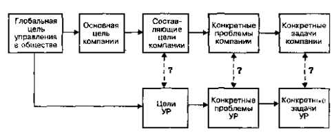 Процесс разработки и реализации УР должен быть ориентирован на достижение выработанной в компании цели. Это вытекает из обобщенной схемы цикла ПРУР, приведенной в ответе на 8-й вопрос. При этом цель ПРУР может отличаться от цели компании, например в случае, когда УР направлено на реализацию только части цели компании. Таким образом, первичной является цель компании, а вторичной — цель УР (рис. 1).