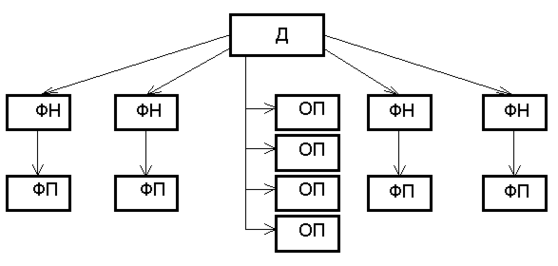 Д- директор; ФН - функціональні начальники; ФП – функціональні підрозділи; ОП – підрозділи основного виробництва