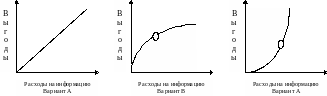 На рис. 1 проиллюстрированы три варианта обстоятельств, с которыми может столкнуться руководитель, оценивая затраты и выгоду от дополнительной информации. По варианту “А” выгода от каждой дополнительной единицы информации равна затратам на ее получение. В той мере, в какой руководство готово платить за получение дополнительной информации, оно будет иметь дополнительную выгоду. Однако ограничения временных и интеллектуальных возможностей менеджера в плане усвоения и использования все большего количества информации должны, в конечном счете, сделать покупку дополнительной информации экономически нецелесообразной.