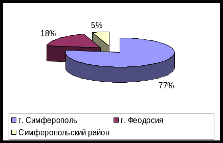 Наиболее крупная сеть оптовой торговли среди регионов АРК сформировалась в г.Симферополе. На долю Симферопольских предприятий пришлось около 61% общего объема оптового товарооборота. Из остальных регионов наибольший удельный вес заняли предприятия г.Феодосии (более 14%) и Симферопольского района (более 4%).
