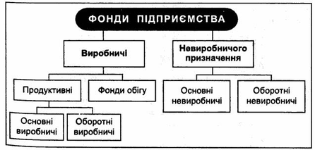 Виробничі фонди включають продуктивні фонди і фонди обігу. Продуктивні фонди поділяються на основні та оборотні. З допомогою саме цих фондів виробляється продукція (послуги). Фонди обігу — це готова продукція, що перебуває на складі підприємства, а також відвантажена, але ще не оплачена покупцями продукція, кошти на рахунку підприємства, які необхідні для придбання предметів праці та виплати заробітної плати. Фонди обігу не входять до продуктивних фондів: вони не беруть участі в процесі виробництва. Проте вони входять до складу виробничих фондів. Це пов'язано з тим, що на підприємстві є ще фонди невиробничого призначення. Вони використовуються для невиробничих потреб (житлові будинки, спортивні споруди, будинки культури, бази відпочинку, дитячі садки і ясла тощо). Фонди обігу в кінцевому підсумку мають виробниче призначення, навіть продукція, яка знаходиться на складі, після реалізації дає кошти, що спрямовуються на виробничі цілі. Через це фонди обігу не можна включати до фондів невиробничого призначення[3].