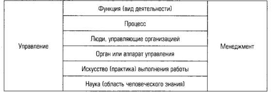 В годы перехода российской экономики на рыночные основы ведения хозяйства наряду с привычным словосочетанием «управление организацией или предприятием» стало нередким и другое - «менеджмент организации или предприятия». В настоящее время они чаще всего используются как понятия идентичные, взаимозаменяемые. Основанием для этого является одинаковая сущность категорий, выражаемых русским словом «управление» и английским «менеджмент» (management). Это находит отражение в определениях данных понятий в фундаментальных работах отечественных и зарубежных авторов, где раскрывается их содержание.