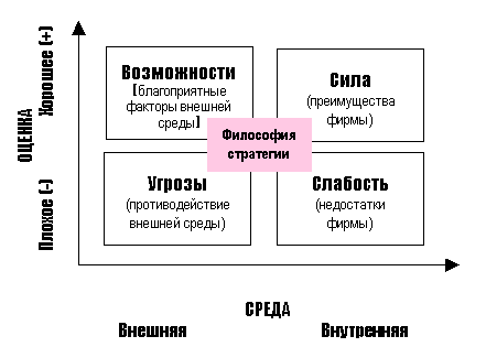 Выбор эффективных стратегий, соответствующих внутренним параметрам предприятия и его положению на рынке и, в целом, во внешней среде, производится путем построения матриц корреляционного SWOT-анализа. Пример такой матрицы для выбора корпоративной стратегии в соответствии с рисунком 3