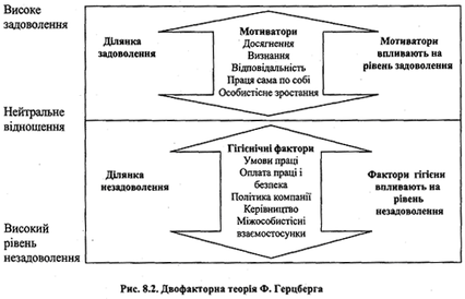 Ще однією концепцією в рамках змістового підходу до мотивації є двофакторна модель Ф. Герцберга (мал.3), яка була розроблена ним у другій половині 1950-х років. Автор показав, що мотивацією на практиці служить не тільки задоволення, але й незадоволення тих чи інших потреб. Причому наростання однієї і спад другої є самостійними процесами, а тому фактори, які впливають на одну з них, не обов'язково впливають на іншу.