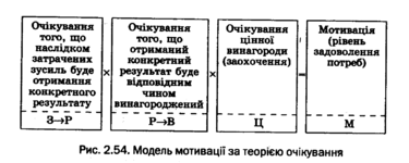 Схематично теорію очікувань можна зобразити за допомогою моделі мотивації (мал.5). Між елементами процесу мотивації за теорією очікування стоїть знак добутку. Це означає, що ігнорування чи не врахування одного з них може знівелювати увесь мотиваційний ефект [10 ст. 163].