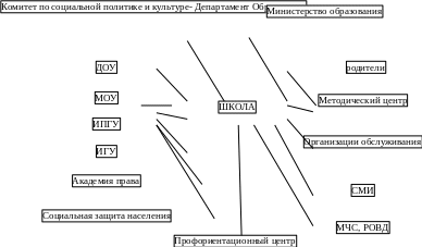 Характеристика внешней среды школы соответствует социокультурной ситуации муниципального образования. Социальный образовательный заказ соответствует приоритетам образовательной политике. Основными партнёрами школы выступают образовательные учреждения общего, дополнительного и профессионального образования. Взаимодействия с ними носят специфический характер образовательного заказа. В современных условиях развития рынка и состояния кризиса во многих сферах производства, необходимы специалисты, обладающие такими качествами как ответственность, мобильность, способность к самообразованию, универсальность навыков. Внешнее взаимодействие можно представить в виде схемы: