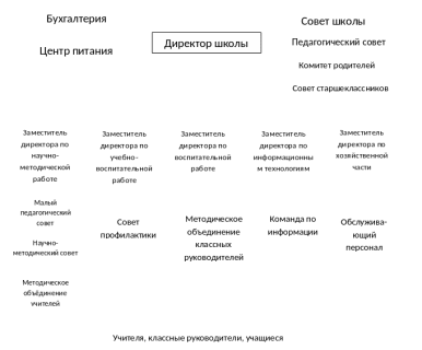 Из этой схему чётко просматривается иерархия и распределение полномочий. Норма управления соответствует необходимым стандартам. Коммуникация структуры школы традиционная. Приказ директора для заместителей в письменной или устной форме, перерабатывается заместителем и передаётся вниз по ступеням. В обратном направлении предусмотрены отчёты как в письменной, так и в устной форме. Выполнение коммуникационных процессов постоянно и проходит полностью с условием чётких рамок указаний или отчётов.