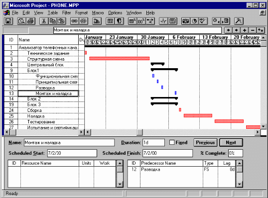 Пакет программ Microsoft Project позволяет легко составить список задач, разделить задачи на подзадачи, назначить связи между задачами. На рис. 4 приведен вид экрана программы Microsoft Project для проекта «Анализатор телефонных каналов». В колонке Task Name приведен список задач проекта, в колонке Duration – их длительность в часах (после цифры стоит буква h) и в днях (после цифры стоит буква d). Длительность задачи определяется на основе принятых нормативных документов.