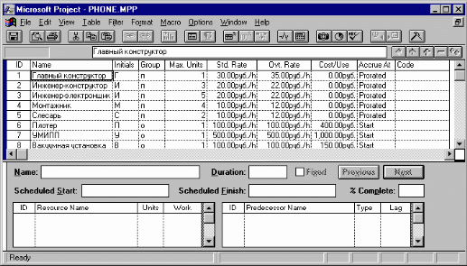 В столбике Max. Units указано количество единиц ресурсов, доступное для реализации проекта. В столбике Std. Rate – стандартная стоимость использования ресурса в течении часа, а в столбике Ovt. Rate – стоимость сверхурочного использования ресурса.