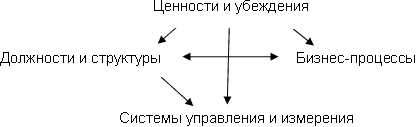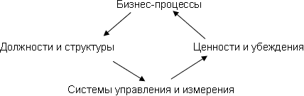 По мнению Майкла Хаммера [1], структуру организации определяют процессы. Способы выполнения работы (бизнес-процессы), определяют характер должности, а также группировку и организацию исполнителей работ (должности и структуру). Сотрудников для выполнения работ по процессам надо нанимать, оценивать и оплачивать с помощью соответствующих систем управления и измерения. А системы управления – то, как оплачивается труд сотрудников, оценивается их эффективность и т.д. – главный фактор, определяющий ценности компании и убеждения ее персонала (Рис. 1).