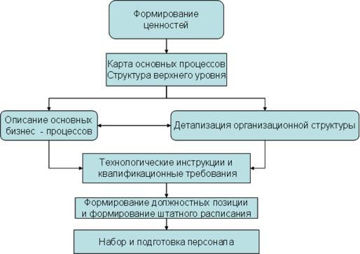 Эффективная организационная структура формируется постепенно, по мере рассмотрения бизнес–процессов организации и их реинжиниринга. Проектирование организационной структуры начинается после разработки стратегии компании, одной из составляющих которой и являются ценности (Рис.4).
