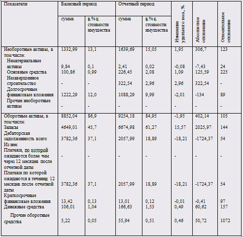 Величина текущих активов в производстве составила на начало года 8852,04 тыс. руб. или 86,9% всех активов, на конец периода – 9254,18 тыс. руб. или 84,95 % всех активов, т.е. из стадии обращения средства перетекают в стадию производства. Основным фактором, повлиявшим на увеличение оборотного капитала в абсолютном выражении, является рост запасов с 4649,01 тыс. руб. до 6674,98 тыс. руб. Удельный вес запасов во всех активах увеличился с 45,7% до 61,27%. С точки зрения устойчивости данная тенденция является отрицательной, т.к. она свидетельствует о снижении ликвидности оборотного капитала.