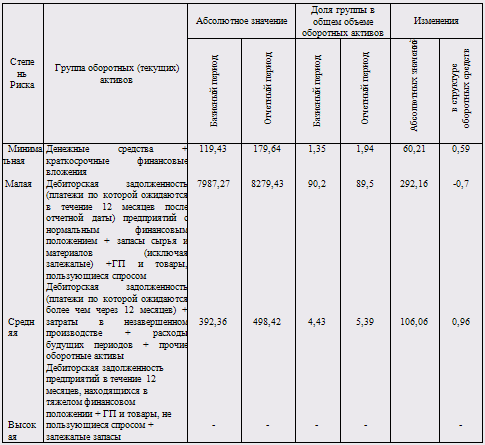 Таким образом, в изменении структуры оборотного капитала можно отметить тенденции снижения ликвидности. Структура оборотных активов по категориям риска приведена в таблице 2.3.