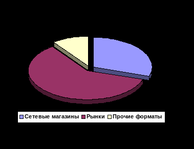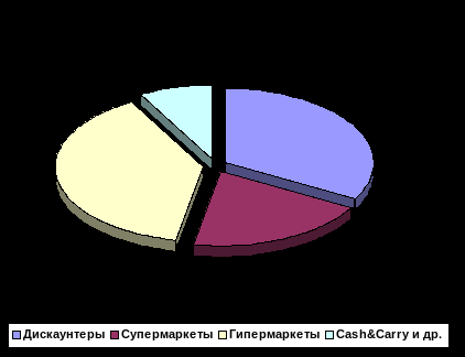 Есть еще одна тенденция сетевого ритейл-бизнеса – если раньше обязательно существовала «цепочка» доведения продукта до потребителя: производитель – крупный дистрибьютор, который после занимался перепродажей и распространением товара в розничных сетях, то теперь эта «цепочка» укоротилась: производители работают непосредственно с торговыми сетями, что непременно сказывается на цене продаваемых продуктов, и в свою очередь увеличивает спрос покупателей на данные продукты в сетевых магазинах. Формы сетевой организации даже внутри отрасли существенно разнятся. Так, согласно анализу, проведённому исследовательской компанией «Step by Step», доля современных форматов сетевой торговли в 2008 году распределилась следующим образом, (см. рисунок 4):