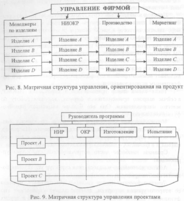Такая схема давно применялась в управлении НИОКР, а сейчас широко применяется в фирмах, ведущих работу по многим направлениям. Она все больше вытесняет линейно-функциональную.