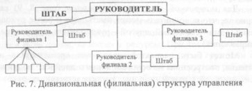 Дивизиональная (филиальная) структура управления (рис. 1.4). Дивизионы (филиалы) выделяются или по области деятельности, или географически.